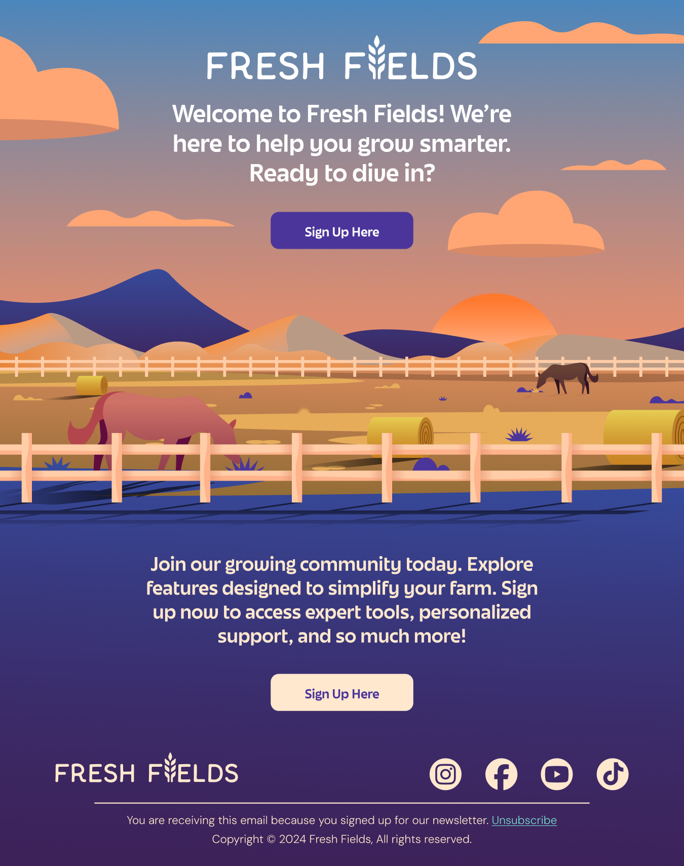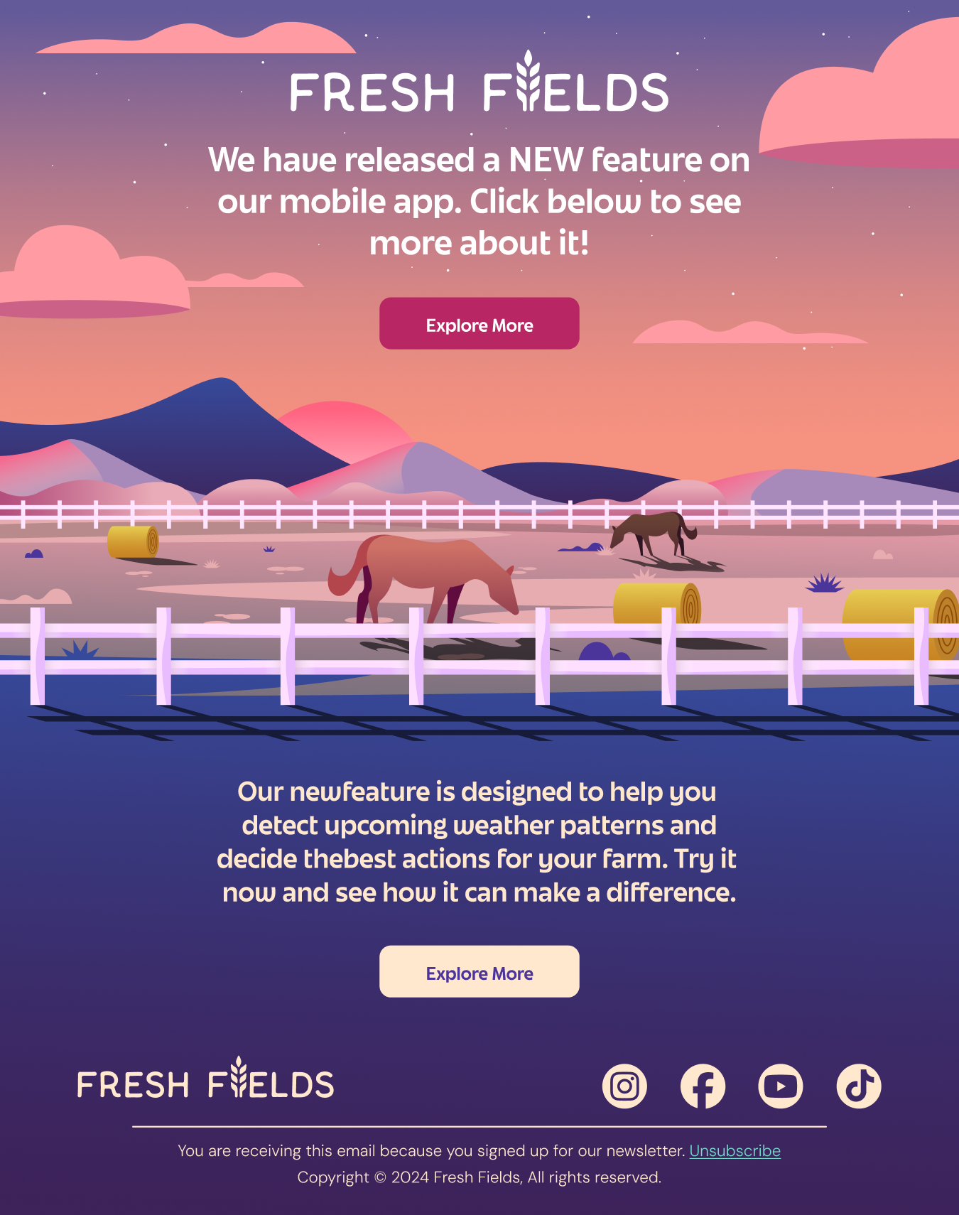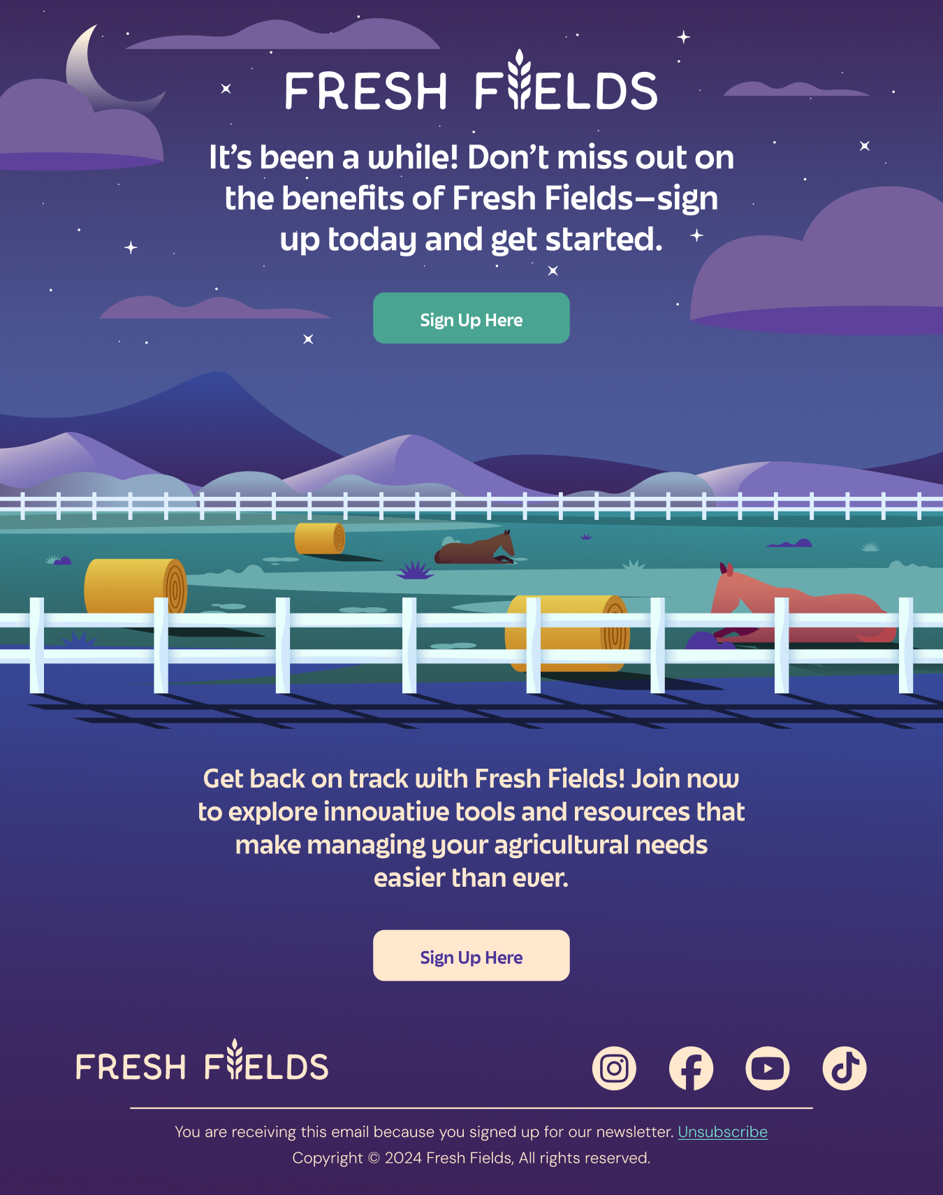 Fresh Fields was an email campaign I created for a conceptual agricultural newsletter. For this project, I wanted to focus more on illustrating interesting visuals and having them serve as the backdrop for the email campaign. The four separate designs evoke different meanings related to the time of day portrayed in the illustrations, including Dawn, Noon, Dusk, and Night time.