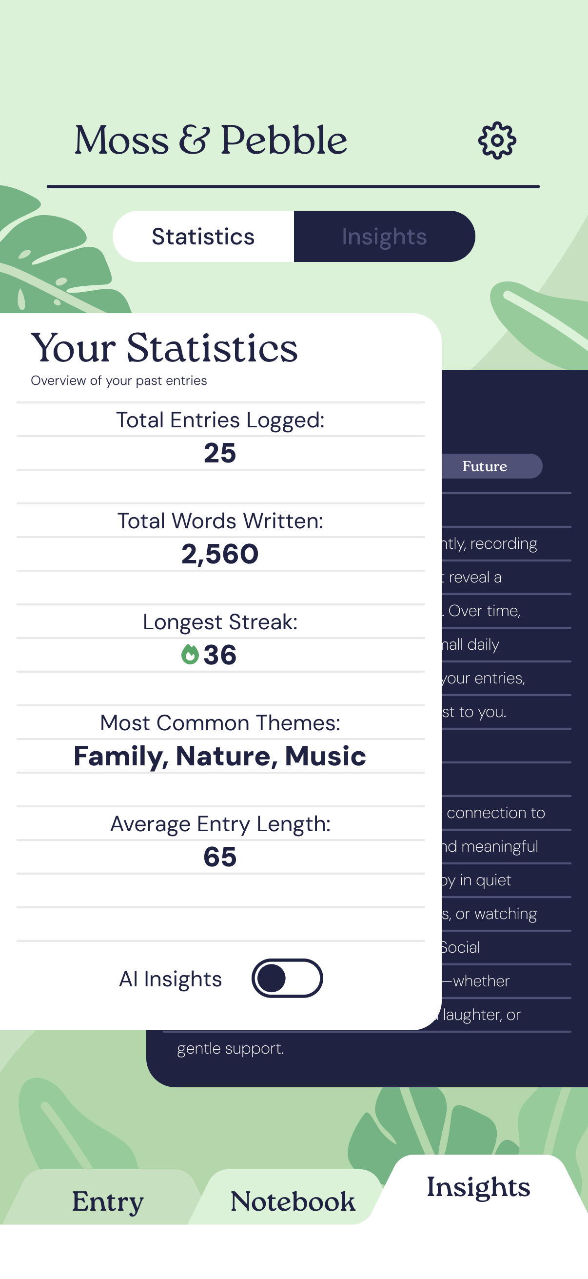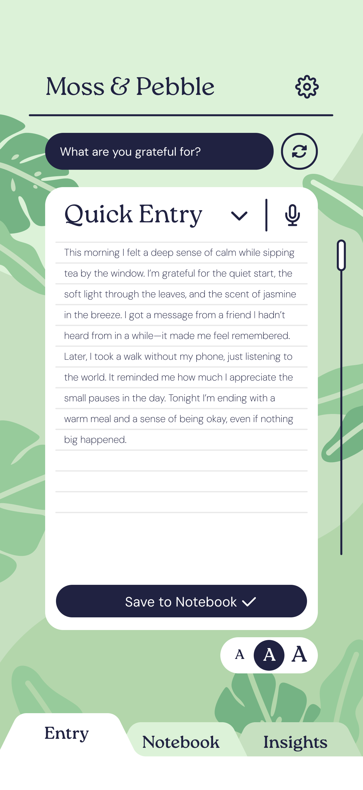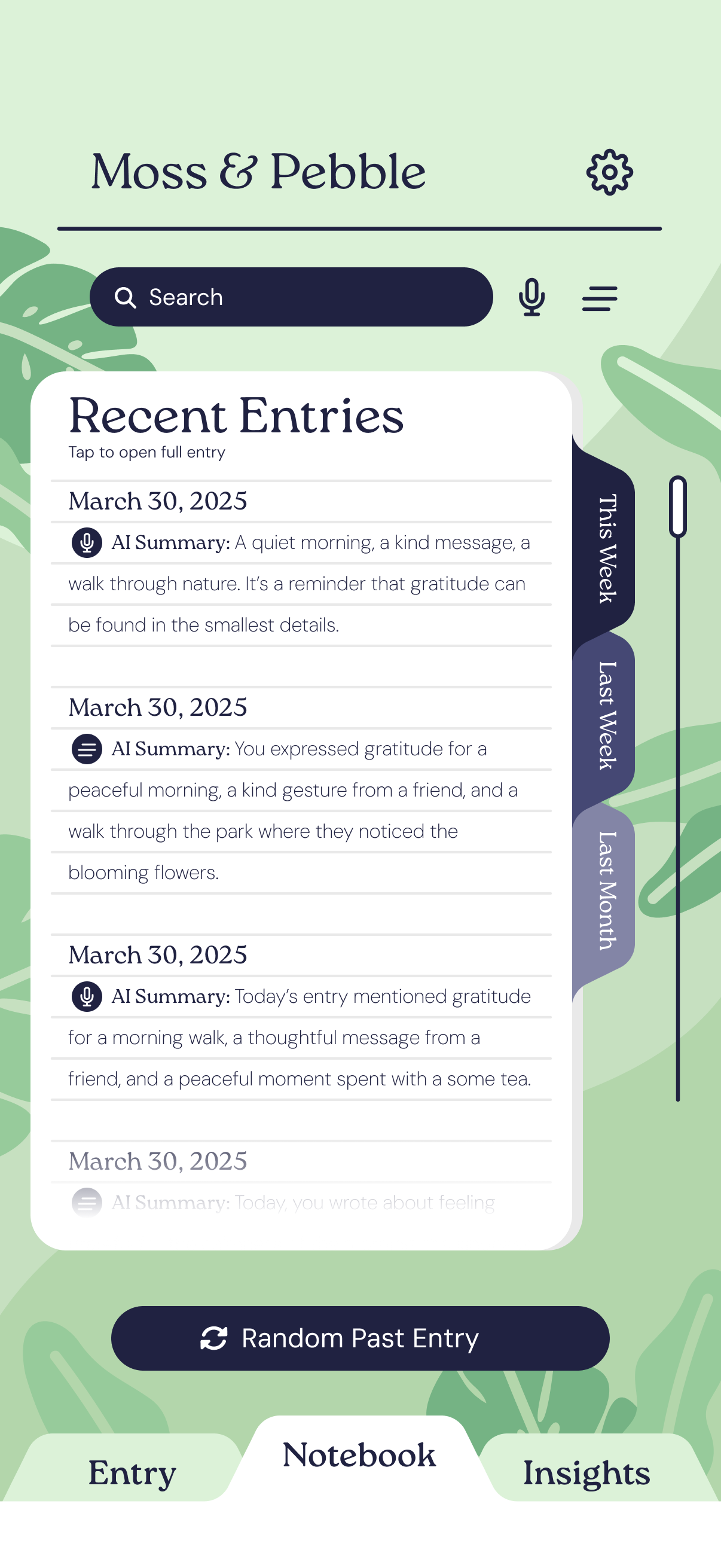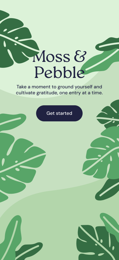 Moss & Pebble was a conceptual gratitude journaling app I designed myself. The main goal behind the design was to make an intuitive interface while still providing a unique visual identity. I wanted to simplify the page interactions to prevent users from getting distracted or overwhelmed, so all the content within the app is contained within the three tabs on the bottom of the screen. For the design itself, I wanted to continue with the theme of simplicity and lack of distractions without removing all life from the design. I wanted the topography and subtle illustrations to create a calming, natural look without overloading the pages. The interactions are simple as well, trading fancy animations for satisfying and brief transitions.